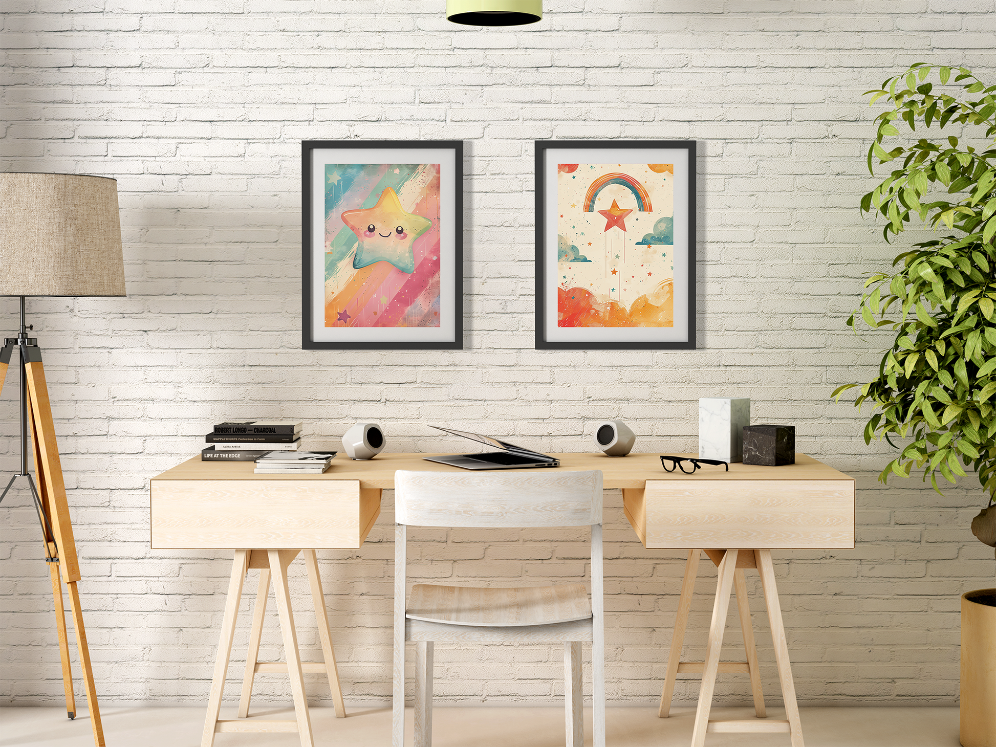 Imagine a poster with a cheerful child's drawing of a star, where artificial intelligence added a 'cosmic touch'. As if the AI wanted to say, “Even in space, there is no limit to childish imagination!” Hang up this starry sky poster and discover how AI and childlike creativity together form a cosmic comedy duo.